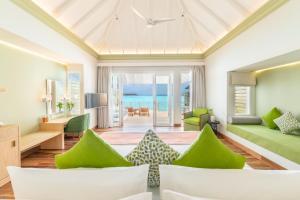 The resort is set amidst lush tropical vegetation, with villas designed to blend traditional Maldivian architecture with modern comforts. Guests can enjoy stunning ocean views, vibrant coral reefs, and serene beaches.